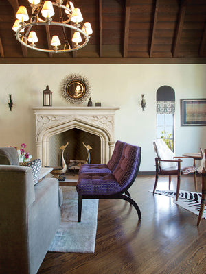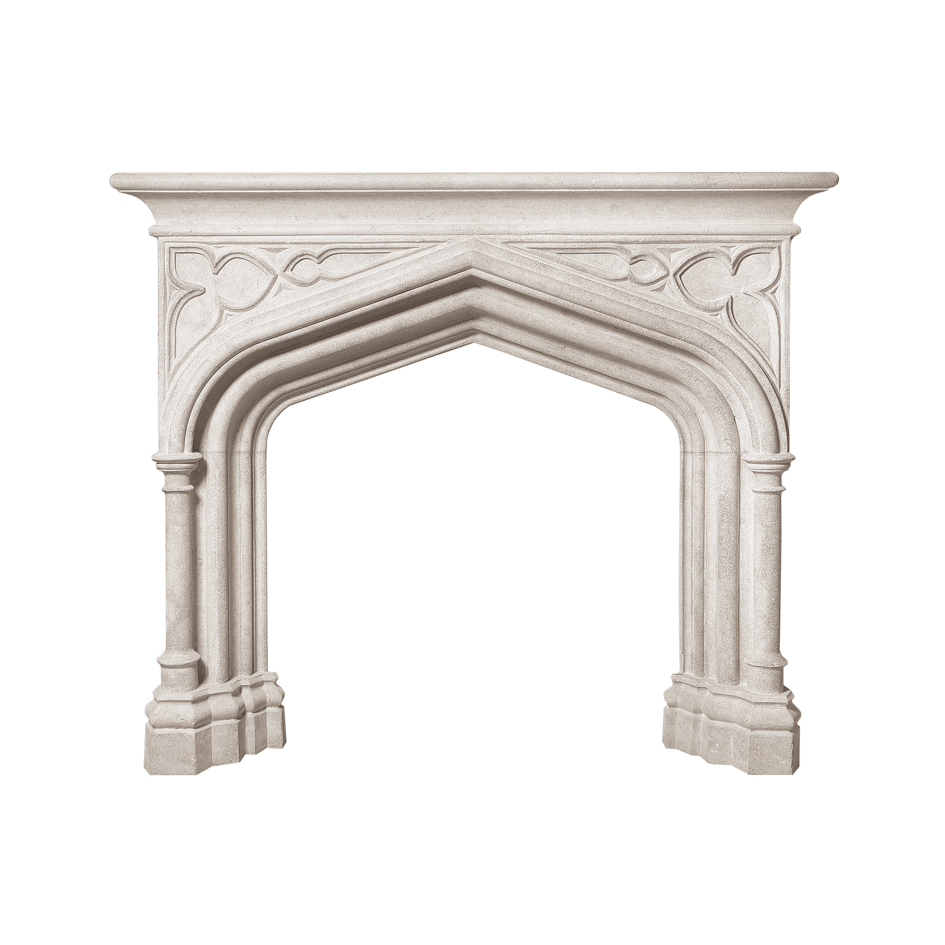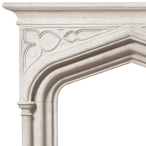The Notre Dame is a highly decorative mantel in neo-Gothic style. The shelf features a Gothic arch decorated with carved motifs inspired by Gothic tracery.